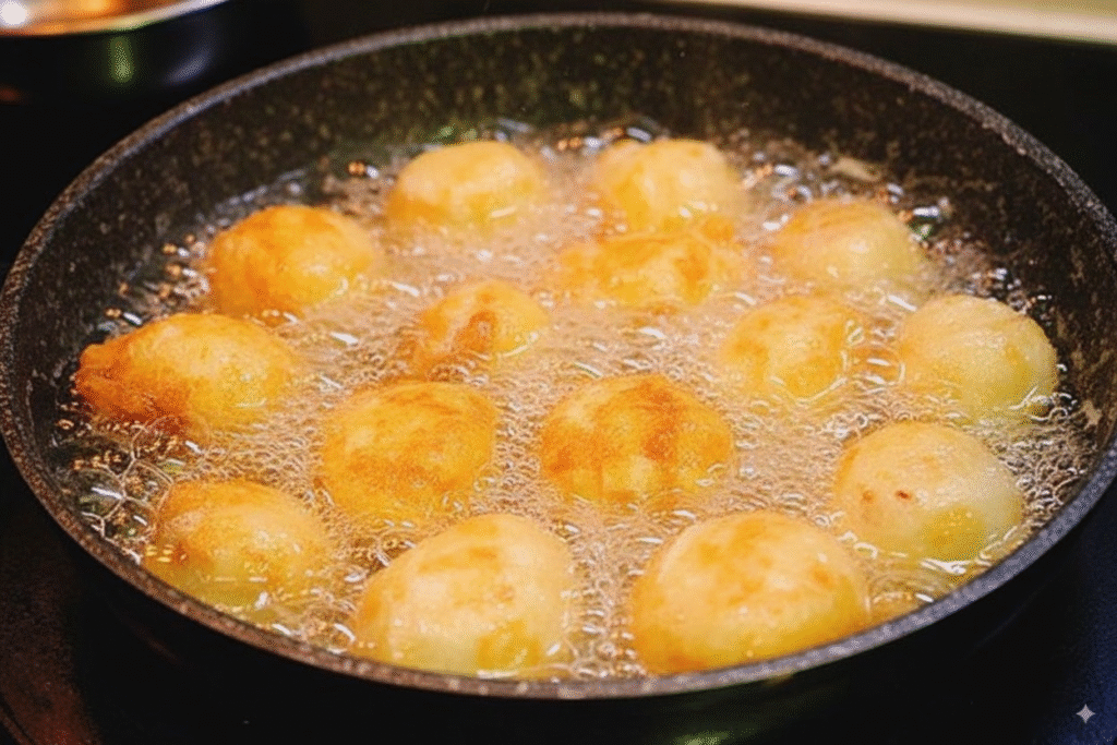 - Đun dầu ngập mặt, thả từng viên đã lăn qua hỗn hợp trứng vào chiên.